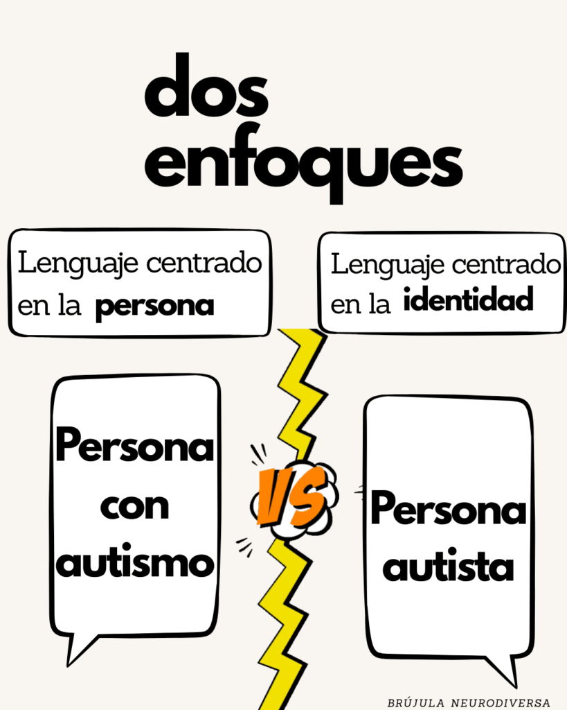 En el lenguaje centrado en la identidad, se celebra que el diagnóstico es parte fundamental de la persona. No es que te defina, sino que es parte de ti, y se lleva con orgullo, pues es parte de tu identidad. Entonces dirías: “persona autista”.